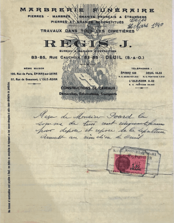 L’un des ses petit-fils, héritier du savoir paternel, lui aussi appelé Régis, choisit de se spécialiser dans la taille de monuments funéraires. C’est alors qu’il installe son atelier artisanal de marbrier Deuil-la-Barre.